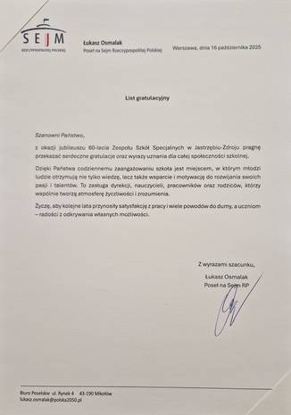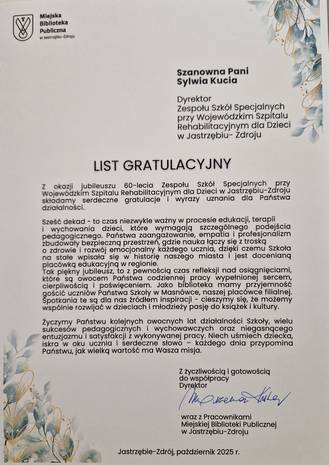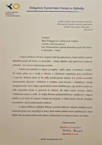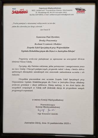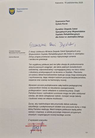 W czwartek, 16 października 2025 roku, w Zespole Szkół Specjalnych przy Wojewódzkim Szpitalu Rehabilitacyjnym dla Dzieci w Jastrzębiu-Zdroju odbyła się wyjątkowa uroczystość – „ Jubileuszowe granie i śpiewanie” III Integracyjny Festiwal Piosenki uświetniający obchody jubileuszowe 60-lecia ZSS przy WSRdD w Jastrzębiu-Zdroju.